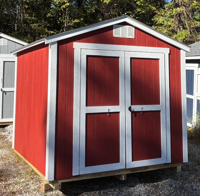#69 -8x8 Gable, Red paint, white trim, , Black shingles.